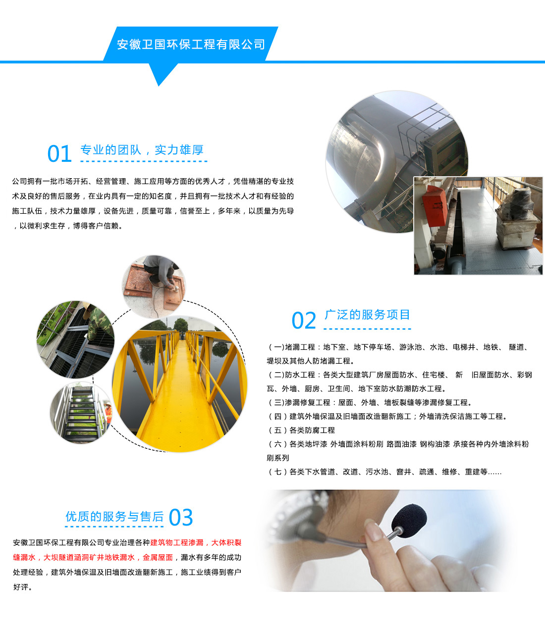 安徽衛(wèi)國環(huán)保工程有限公司專業(yè)治理各種建筑物工程滲漏,大體積裂縫漏水,大壩隧道涵洞礦井地鐵漏水,金屬屋面,漏水有多年的成功處理經(jīng)驗,建筑外墻保溫及舊墻面改造翻新施工,施工業(yè)績得到客戶好評。